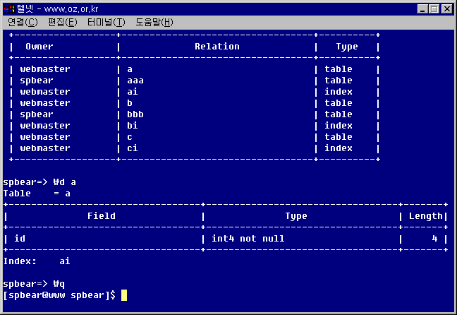 | \dt | 데이터베이스내의 테이블의 리스트만 표시해 준다. |